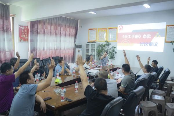 會議環節,安環委主任通篇朗讀新版《員工手冊》安全管理條款,公司各部門中層及以上管理人員共同討論審議,舉手表決,全票通過。新版《員工手冊》將于2023年7月在朝陽集團正式啟用執行。